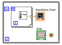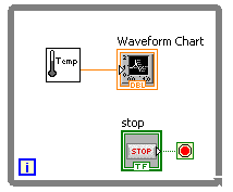 使用波形图控件的一个最简单的方法就是将一个数值在VI程序框图中连接到波形图控件的输入端点,如下图所示。在每循环一次就会有一个点被添加到波形图中所显示的波形中。