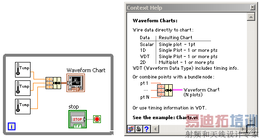 不过有一个简单快捷的方法可以找出用于某种曲线图或波形图的数据类型。这个方法就是在程序框图中,将鼠标光标移动到曲线图或波形图输入端点上方,这时在Context Help窗口中就可以看到曲线数据类型的详细描述了。这个Context Help窗口可以通过菜单Help>>Show Context Help或者是使用快捷键