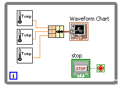 波形图控件也可以用来显示多条曲线。不过,由于比不能从多个数据源连线到单一的波形图控件输入端点,所以需要先使用捆绑函数(Bundle函数,可以在 Programming>>Cluster & Variant子面板找到)将多个数据捆到一起。如下图所示,该函数“捆绑”或聚合了三个不同的采集温度的VI的输出到了一个簇中,以便这些数据能够被波形图控件说显示。大家可以注意一下波形图控件的端点连接到捆绑函数的输出之后的变化。如果需要添加多个曲线,只要增加捆绑函数的输入端点的个数即可。