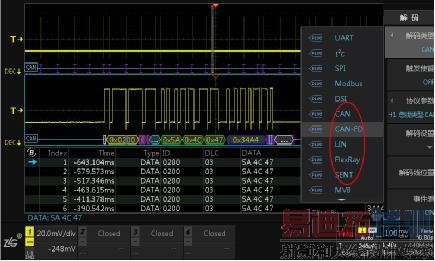 1)免费标配30余种协议解码:包括汽车电子行业常用的CAN、LIN、FlexRay、SENT、CANFD。与业界其他示波器需要付费选配,且普遍只支持一帧波形解码相比, ZDS4054Plus可支持基于512M存储深度的70s CAN波形解码,其大存储可以保证监控整个通信过程,如图3、图4所示。