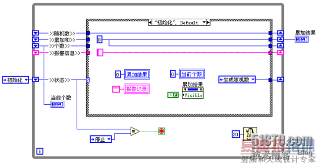 状态机是由一系列的状态构成的,其中包括一个“初始化”状态,和一个“停止”状态。程序油“初始化”状态开始,由“停止”状态结束。一般来说,在“初始化”状态中进行控件与变量的初始化、打开文件以及创建引用等操作,而在“停止”状态中进行清除临时数据、关闭文件和结束引用等操作。在状态机中,每一个状态都可能导致一个或多个状态的发生,其下一状态是由用户的输入信息和当前状态所决定的。