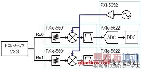 在图 3 中可看到 PXIe-5663 - RF 向量讯号分析器是由 PXI-5652 连续波合成器、PXIe-5601 - RF 降转换器,与 PXIe-5622 - IF 示波器所构成。当向量讯号分析器整合 PXIe-5663 MIMO 扩充组合时,随即新增了降转换器与示波器,以建构双信道的 RF 撷取系统。