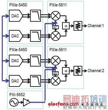 若要设定任何相位同调 RF 系统,则必须同步化装置的所有频率讯号。透过 NI PXIe-5673 - 6.6 RF 向量讯号产生器,即可直接进行升转换 (Upconversion),以将基频 (Baseband) 波形编译为 RF 讯号。图 2 即说明双信道 RF 向量讯号产生器的基本架构。