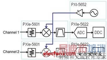 与传统的 3 阶段式超外差 (Superheterodyne) 向量讯号分析器不同,此架构仅需于各个通道之间同步化单一局部震荡器 (Local oscillator,LO),因此为设定相位同调应用最简单的方法之一。若要同步化多组 PXI-5663 分析器,则必须于各组分析器之间分配共享的 IF 取样频率与 LO,以确保各个通道均是以相位同调的方式进行设定。图 3 则为双信道系统的范例。
