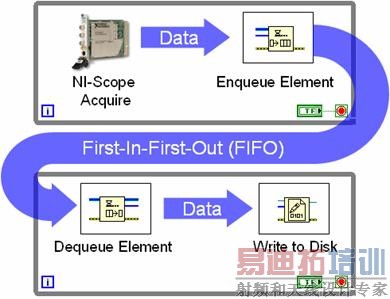 如图所示,队列支持多个循环间的数据共享。上图所表示的是典型的所谓生产者/消费者循环结构。这里,在一个循环中,一个高速数字化仪持续采集数据,并在每次迭代中将新的数据集传递至FIFO队列。消费者循环仅需监视队列的状态,当每个数据集可用时将其写入磁盘。采用队列的意义在于这两个循环均可相互独立执行。在上例中,高速数字化仪可以持续采集数据,即使这些数据写入磁盘时存在一定的延迟。与此同时,其它的采样仅需存储在FIFO队列中。通常,生产者/消费者管道式方法,通过支持更有效的处理器利用率,使更高的数据吞吐量成为可能。这一技术优势在多核处理器中甚至更为显著,因为LabVIEW可以动态分配CPU线程至每个处理器核。