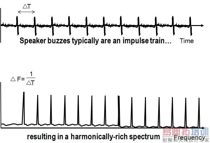 总谐波失真主要是由第二阶次和第三阶次谐波占主导作用,几乎很少与我们可以听出来的音频失真相关。例如,考虑下面这个扬声器的杂音。该扬声器的杂音是典型的导致丰富谐波频谱的脉冲串。