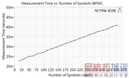很显然,部分脉冲测量的优点是可以缩短较长脉冲的测量时间。造成这个结果的原因就是对于较长的脉冲序列来说,进行一次测量的准备时间(内存分配、驱动调用以及数据采集的时间)与整个脉冲的测量时间相比仅占很小的一部分。而与之相反,对较短的脉冲序列(例如64-QAM和16QAM)来说,相对于使用的符号来说,灵活性就相对小了。例如,一个64-QAM脉冲序列仅包括39个先头符号。因为您需要多于16个符号来进行可重复的EVM测量,所以您将不能在64-QAM脉冲序列上显著地缩短测量时间。图3显示了针对54Mb/s的脉冲其测量时间与符号数目的关系。