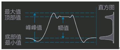 2、自动测量,当示波器正确捕获波形后,示波器可以对波形参数进行自动测量。自动测量需要参考点,一般称为Vtop(顶部值) 和Vbase(底部值),参考点的测量采用幅度统计方法。示波器的工作过程是对捕获波形进行的幅度分析,先确定最大值Max和最小值Min,然后对最小电压上的40%和最大电压下的40%进行分析,然后进行累积概率统计,出现概率最大的值为Vtop 和Vbase。不用统计中间20%部分,防止被测波形是3态信号得出错误结果。