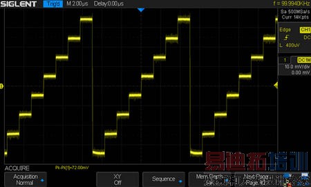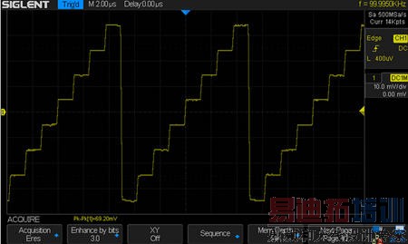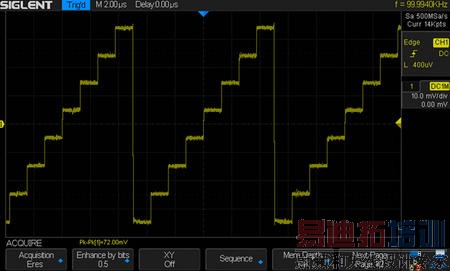 最后看看增强分辨率,增强分辨率采样模式能有效提高信噪比,虽然周期的波形看起来和平均采样模式很像,但是增强分辨率采样模式不依赖信号的周期性和触发点的稳定性,它是一帧内的一个处理,原始波形如下: