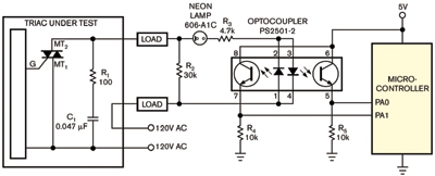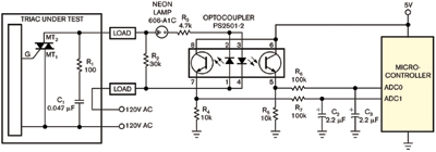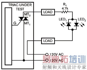 图1、图2和图3中测试结果的指示器均为LED。有些情况下,双向可控硅的测试是一个多任务测试系统的一部分,用于检查整个设备的其它元件或参数,包括双向可控硅。这种测试包含一个测量序列,系统操作者只获得两个可能信号中的一个:合格或不合格。这些测试采用一种基于微控制器的系统。因此,所有接口信号均为数字格式:高或低。