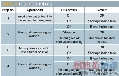 测试过程只花不到5s,包含4个步骤(表1)。LED向测试操作者显示每个步骤的结果。如果所有四步测试均获通过,则双向可控硅合格。在制造期间要再做一次双向可控硅测试,以保证装配板没有问题,双向可控硅工作正常。这一测试可节约时间与人工,避免整件产品装配完后才发现问题。做此测试时双向可控硅已焊在电路板上。使用的电源电压为标称120/220V AC。测试应对DUT有最小影响,并使用最少的时间与工作量。测试中用双向可控硅测试仪代替一个负载。从测试仪到DUT的连接可以有变化,而且要确保在连接120/220V AC时采取一些安全措施。