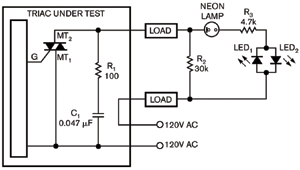 针对驱动阻性负载的双向可控硅要用不同的测试设备,如白炽灯或加热器(图2)。每只LED检查一个方向的导通性。当双向可控硅关闭时,两只LED均熄灭。而在打开时,两只LED均应发光。对于感性负载(如电机),双向可控硅要并联一个由C1和R1组成的RC缓冲电路(图3)。不幸的是,缓冲电路会使测试电路产生一个小的电流泄漏,即使在双向可控硅已关闭的情况下。图3中的电路表示如何用电阻R2和一只交流击穿电压为95V的氖灯,避免这个问题。