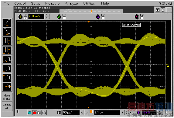 Figures6到10显示了5个示波器上显示出来的眼图,所有的实时示波器在边沿前后都表现出来了过度的振铃,这也表明了实时示波器的阶跃响应不太好。这些实时示波器只具有50ps的分辨率,为了克服这个缺点,采用了Sin(x)/x或sinc内插,这种内插可以很好的再现正弦波,但对方波的效果却不好。今天的串行数据越来越变得像方波,所以评估示波器性能时查看串行信号的表现是极其重要的。
