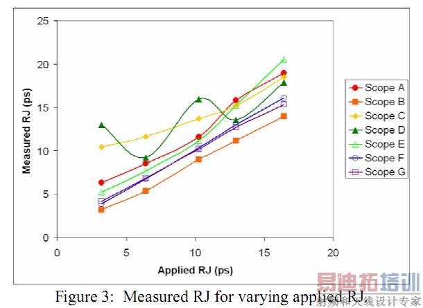 对于不同的pj1幅度,Rj预期都是不变的9.6ps。图7展示了Rj测量值。我们看到ScopesF和G的趋势是非常平坦和靠近期望值的。ScopesB,A和C越来越背离预期趋势。ScopesD和E则呈非线性和大的波动。