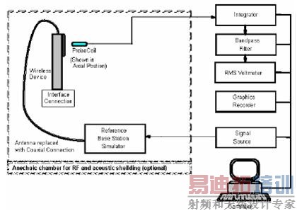6.赫尔姆霍茨校准线圈测量方法为:控制无线通讯设备使其处于通话模式下,要求基站模拟器能够向无线通信设备提供模拟的音频信号。基站模拟器控制无线通信设备使其处于最大发射功率状态。这主要是考虑到其在最大功率模式下准确计入其基带部分可能会对听筒中的线圈产生的影响。要注意的是测量时需要用RF线进行链接而不是通过无线方法链接,这主要是为了屏蔽测量过程中射频传输信号对测量结果所造成的影响。整个测试过程是由以下多级程序完成,首先测量对助听器T-coil有用的音频频段的磁场场强。第二步测量无意信号磁场分量,用以确定来自无线通信设备显示器和电池电流通路等对音频频段有意信号所造成的影响。以下是测量的大致流程: