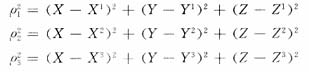 GPS定位是根据测量中的距离交会定点原理实现的[2].如图1所示,在待测点Q设置GPS接收机,在某一时刻tk同时接收到3颗(或3颗以上)卫星S1、S2、S3所发出的信号。通过数据处理和计算,可求得该时刻接收机天线中心(测站点)至卫星的距离ρ1、ρ2、ρ3.根据卫星星历可查到该时刻3颗卫星的三维坐标(Xj,Yj,Zj),j=1,2,3,从而由下式解算出Q点的三维坐标(X,Y,Z):