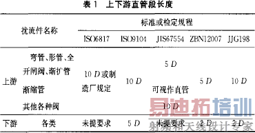 为获得正常测量精确度,电磁流量传感器I游也要有一定长度直管段,但其长度与大部分其他流量仪表相比要求较低。9O.弯管、T形管、同心异径管、全开闸阀后通常认为只要离电极中心线5倍直径(5D)长度的直管段,不同开度的阀则需1OD;下游直管段为2~3D或无要求。但要防止蝶阀阀片伸人到传感器测量管内。各标准或检定规程所提出上下游直管段长度亦不一致,汇集如表1所示,要求比通常要求高,这是由于为保证达到当前0.5级精度仪表的要求。