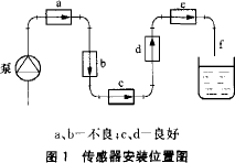 水平安装时要使电极轴线平行于地平线,不要处于垂直于地平线,因为处于底部的电极易被沉积物覆盖,顶部电极易被液体中偶存气泡擦过遮住电极表面,使输出信号波动。图1所示管系中,c、d为适宜位置;a、b、e为不宜位置,b处可能液体不充满a、e处易积聚气体,且e处传感器后管段短也有可能不充满,排放口最好如?形状所示。对于固、液两相流C处亦是不宜位置。