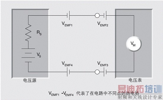 如果所有的电路连接都用一种金属材料来实现,那么在测量工作中所引入的热电动势将是可以忽略的。然而这并非总是可以做到的。测试夹具常常采用弹簧触点的连接方法,这些触点可能由磷青铜、铍铜合金或者其它具有高赛贝克系数的材料制成。在这些情况下,很小的温度差别就可能产生相当大的热电动势,足以影响测量的准确度。