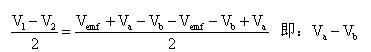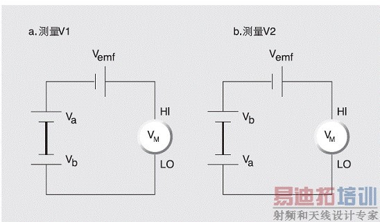 在图2中,电压源Va、Vb代表两个标准电池(或者两个热电偶)。在图2a中测量出的电压为: