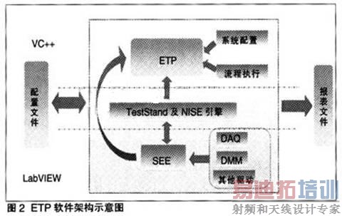 图2是ETP软件架构示意图。上层管理软件ETP采用C++编程。底层驱动管理模块SEE(SignaI ExecuteEngine)采用LabVIEW编程。上层管理软件通过调用SEE实现测试测量的功能。采用C++开发,使ETP更具平台性和拓展性,最直接的优势是运行效率高。软件总体框架是: