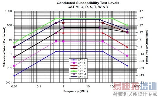 该测试用来确定当EUT和它的互联电缆暴露在射频干扰之中时,EUT是否会按要求运行。需要连续波(CW)、调幅方波(SW)、和脉冲调制(PM)射频信号。线性阻抗稳定网络(LISN)必须与每根电源线和未接地的电源回路串接,并且在LISN的电源输入和接地平板之间接入10μF的电容。除非另有规定,互联线缆至少需3.3米长,电源线不能超过1米。