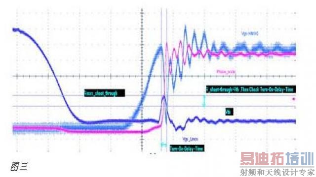 测试的目的是看上MOS管导通时,有没有同时把下管打开,从而导致电源直接导通到地而引 起短路。如图三所示蓝色曲线(Vgs_Lmos)就是下管在上管导通的同时,被带了起来,如果蓝色曲线的被带起来的尖峰超过了MOS管的Vth要求,同时 持续时间(Duration)也超过了datasheet要求,从而就会有同时导通的风险。当然,这是大家最常见到的情况。