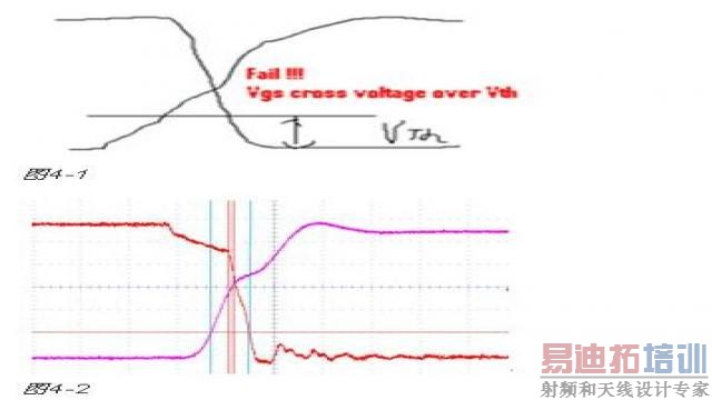 下面这种情况有非常多的人会忽视,甚至是一些比较有经验的电源测试工程师。下面组图四是下管打开,上管关闭时候的波形(图4-1是示意图,图4-2示实 际测试图)。虽然没有被同时带起的情况,但是请注意上下管有交叉的现象,而且交叉点的电平远高于MOS管规定的Vth值,这是个严重的shoot through现象。最直接的后果就是MOS管烧毁!
