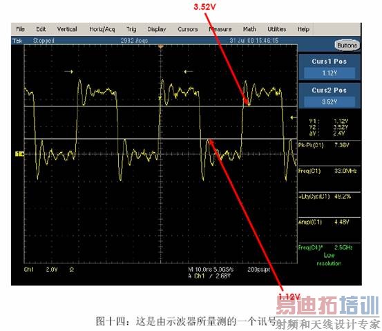 如图十四,这是由示波器所量测的一个33MHz的讯号,可看出此讯号有过冲及振铃