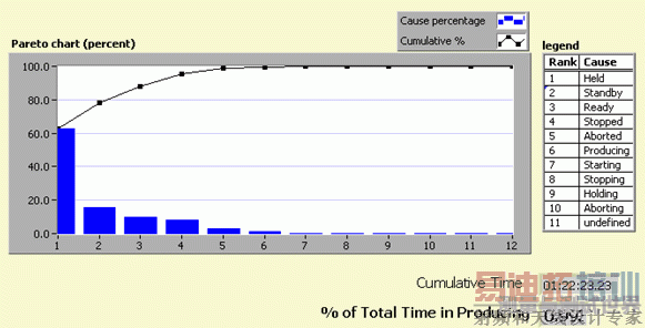 LabVIEW利用帕累托图表进行实时性能分析,帮助现场工程师缩小造成机器宕机的主要原因的范围。该分析是通过LabVIEW DSC模块中提供的统计过程控制函数完成的。无论给定的是未排序的动因列表或动因列表及其每项动因的发生频次,帕累托计数器将列表中的动因按发生频次由高到低排列,并为每项动因计算帕累托统计数据。给定一组帕累托值(帕累托计数器VI的输出),可以创建得到两张帕累托图表和相关的图例。一个是每项动因发生频次的柱状图;另一个则是每项动因贡献的百分比柱状图;该相关图例是动因代码及其排序的列表。例如,如果机器的最大一部分时间处于阻止状态,您可以检查何种动因导致机器被阻止如此长的时间。这种故障的动因可能是因原材料不一致或操作者失误而引起的频繁阻塞。处于生产状态的时间占总时间的百分比越高,您的机器就越有效。