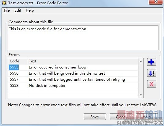 上述这种方式,如果程序很大时,为了不遗漏掉各部分可能产生的错误,我们需要不断的放置General Error Handler函数,并给它不断的配置“用户自定义代码”和“用户自定义描述信息”,时间长了,就难于维护,而且很难面面俱到,而且增大代码的体积和占用配图的空间。有没有一种全局的方式呢?答案是肯定的,在LabVIEW中通过:工具>>高级>>编辑错误代码,弹出错误代码编辑对话窗口,可以新建或修改现有的文件。在错误编辑窗口中可以添加自定义错误代码和相应的文本描述信息。如果是新建的文件,点击Save按钮时会弹出对话框提示保存,文件名称必须是xxx-errors.txt,xxx是用户可以自由命名部分。xxx-errors.txt文件的存放目录必须在:盘符:Program FilesNational InstrumentsLabVIEW 2011user.liberrors目录下(这里以LabVIEW 2011为例,其中盘符为LabVIEW所在的安装目录),如果没有errors目录,可以手动创建。xxx-errors.txt文件在LabVIEW关闭并重启后才生效。