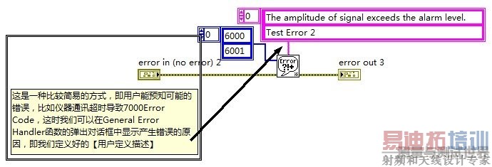 如果希望程序在执行过程中出现错误时能给出更有意义的提示信息,我们可以使用自定义错误处理。首先评估一下该应用中,有可能会出现哪些错误,并给这个错误赋特定的错误代码(error code)和描述信息(description)。LabVIEW预留了以下错误代码供用户自定义错误使用:-8999到-8000,5000到9999,500000到599999。比如:在一个数据采集应用中,需要监测外部信号的幅值,当幅值大于8V时,我们可以定义该错误码为6000,并通过General Error Handler函数弹出相应对话框。(参考basic error handling.vi)