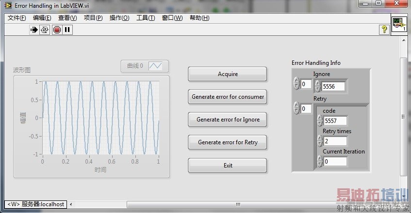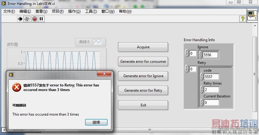 好了,到这里为止。基础知识我们介绍完了,接下来我们介绍对于可预见的错误,是否可以选择直接忽略,或者前几次尝试忽略直到该特定错误出现很多次后才通知用户需要纠正该错误了;是否可以对重要的错误进行存档;当主VI中多个线程时,如果某一个线程出错,如何保证其它线程进行适当的收尾后同样优雅的退出,避免一错再错。这里我编写了一个参考VI,我们将详细介绍:
