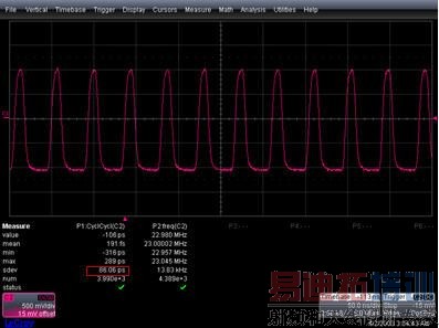 4.使用LeCroy示波器测量EasyPulse脉冲的周期到周期抖动,RMS值(测量的sdev值)在100ps以下。