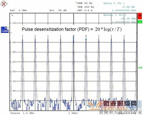 用频谱分析仪进行脉冲的频谱分析,设置较大的RBW可观察包络谱,根据包络第一零点的位置计算脉冲的脉宽;设置较小RBW值则也可以观察线状谱,测量脉冲的重复频率,计算脉冲的周期;在频域还可以用信道功率测量功能测量脉冲的平均功率,也可以用大的RBW来测量脉冲峰值功率;