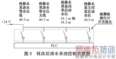 现场安装磁翻板液位计时, 装置标尺的0 位, 对应的实地高程为EL .40 .0 m 。浮子开关设定5 个水位动作值, 检修水位低开关量报警值对应的高程为40 .3 m ;停止所有检修水泵的开关量, 所对应的高程为40 .5 m ;启动主用检修水泵的开关量, 所对应的高程为40 .9 m ;启动检修水泵主用泵的开关量, 以及要求手动启动大泵, 并作为水位高报警上送上位机, 所对应的高程为41 .1 m 与41 .2 m , 两个开关量并列接入。全部开关量分别送入PLC , 如图3所示。
