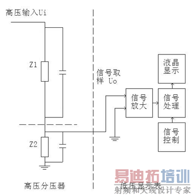 直流数字分压器采用阻容分压法测量高压交直流,如图1所示。左侧是高压部分,采用阻容分压电路,由阻抗Z1和Z2两部分组成。高压Ui从上端均压球处输入,从阻抗Z2处输出低压取样信号Uo;右侧是低压显示表,用于处理低压取样信号Uo。低压取样信号Uo经整流滤波放大处理后送入低压显示表显示。高压Ui和Uo关系式如公式(1)所示: