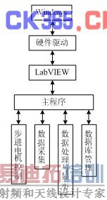 如图4所示,圆锯片平面度检测系统软件包含五个主要部分[4]:主程序负责系统界面管理,程序流程控制及各个模块之间的协调和通讯;步进电机控制模块控制步进电机的启动和停止;数据采集模块采集锯片平面与电涡流传感器探头间的位移信号;数据处理与显示模块对采集的位移信号进行处理并显示在前面板;数据库管理模块完成数据存储和回放、报表生成等功能。
