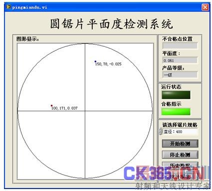 圆锯片平面度检测系统的前面板见图5,包括显示部分和控制部分。显示部分以数值形式显示锯片平面度值、不合格点位置 (如果存在的话);以文字的形式显示产品等级;以图形的形式显示被检测锯片上最“凸”的点和最“凹”的点,并以不同的颜色区分;以LED显示运行状态及合格与否。控制部分可以选择待检测锯片规格,并执行检测、历史数据回放、报表生成、停止等功能。