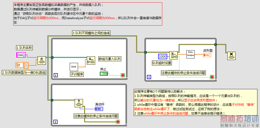 此程序学到的知识:1 队列数据类型设置为常量,所以用于数据显示的控件为波形图控件;2 注释的箭头设置:函数->编程->结构->修饰