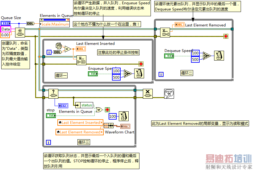此程序学习知识点:1 对于队列的创建:通过队列创建函数的名字搜索该引用,如果没有则创建,如果有,则直接加入队列2 此程序采用三个while循环创建三个线程,并将数据同时加入一个队列中,并最终进行显示3 注意此程序中对while循环的停止条件的处理;
