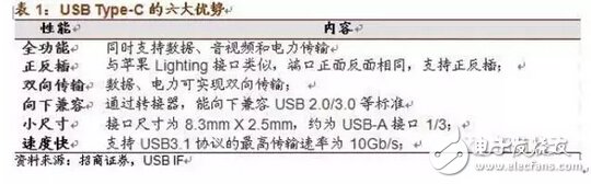 其一、现在所有使用USB接口的地方都可以使用Type-C代替;其二,根据对充电速度、数据传输速度、视频兼容等需求的不一样,连接线/接口解决方案价格区间较大,兼容USB3.1、PD和Display Alt Mode等全协议的解决方案可以是普通Type-C的10倍;其三,在产品过渡期会有大量的转接线需求,以兼容各类不同格式的老产品;其四,衍生应用多,例如3.5mm接口取消后,就会催化智能数字音频市场,并且将来还会增加如VR/AR等很多新的应用场景等。