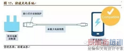 快速充电系统包括快充标准,快充电源适配器,接口E-marker芯片,线缆,手机芯片,电池等多个部分。各部分都必须针对不同标准专门设计,才能实现快充功能,并且保证充电安全。