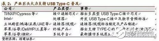 · 终端厂商:苹果和谷歌最早在笔记本平板电脑上使用Type-C接口,预计后续机型也将开始使用新的接口。Intel也开始在软硬件两端着手准备用USB Type-C取代3.5mm模拟音频接口。在数据存储、显示、快速充电、扩展坞等其他应用方面,都已经有很多USB-C接口的产品上市。