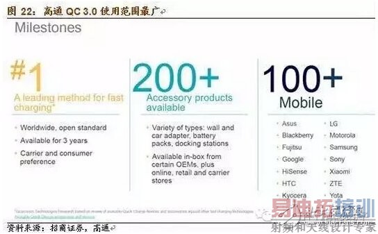 高通QuickCharge采用高压快充标准。得益于在手机处理器端的统治级地位,目前有超过100种智能手机都采用高通Quick Charge的方案,现已发展到QC3.0。QC3.0采用高压快充技术,通过3.6~20V动态可调节电压和最大3A电流以实现最大36 W充电功率。同时,QC 3.0采用了最佳电压智慧协商(INOV)技术,可让受电装置自行判断,以最适合的功率级别进行充电,将能源转换效率最大化。