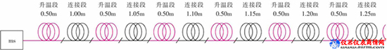 光纤连接方案:光纤上升温段和测点的相对位置会影响测量值大小,以升温段0.5m为例:这0.5m可能恰好覆盖了一个测点所管辖的光纤长度范围,也有可能位于两个测点的中间,此时没有任何一个测点管辖的0.5m完全升温,而理论上这两种情况的测量值是不同的。通过一定连接方案的设计,可以人为控制升温段和测点的相对位置,囊括所有情况。