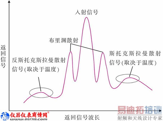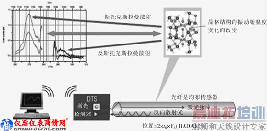 利用拉曼效应进行温度测量。激光脉冲入射到光纤里,在发送端得到背向散射光,并进行分析。拉曼散射光的强度与温度成正比。测量散射光强度得到沿光纤分布的温度。
