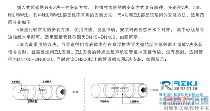 当管道很粗或由于液体中存在悬浮物、管内壁结垢太厚或衬里太厚,造成v法安装信号弱,机器不能正常工作时,要选用z法安装。原因是;使用z法时,超声波在管道中直接传输,没有折射(称为单声程),信号衰耗小。z法可测管径范围为100mm至6000mm。实际安装流量计时,建议200mm以上的管道都要选用z法(这样测得的信号最大)。