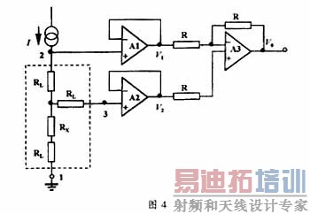 从上式可知,馈线电阻上的附加电压加到A3的输入端,通过求差而消除,输出电压仅与被测电阻有关,且成线性关系。不管被测电阻大小如何,误差都能完全补偿。
