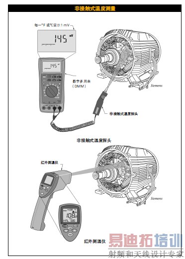 为了测量马达绕组的温度,可以使用连接 到数字多用表(DMM)的非接触式温度探 头或者红外测温仪。请参见图3-1。